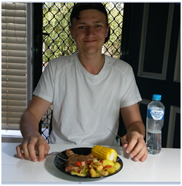 オーストラリアの伝統的な料理を食べたいと言ったら、カンガルーのサイコロステーキ、バターライス、サラダ、デザートを作ってくれました。カンガルーは食用に飼育されており、野生のカンガルーと比べると臭みは少なく、肉質は柔らかいのですが、さらに、ニンニク、ジンジャー、ワインに一日浸け込んで、臭みを減らし、堅くならないように素早く焼いていました。丁度、シカ肉と似た食感で、違和感はありませんでした。