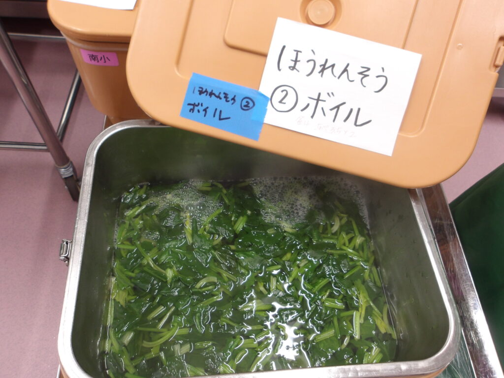 汁物のほうれん草を ①そのまま使う②ボイル③ボイル・水冷の3種類の食味テストを実施しました。
